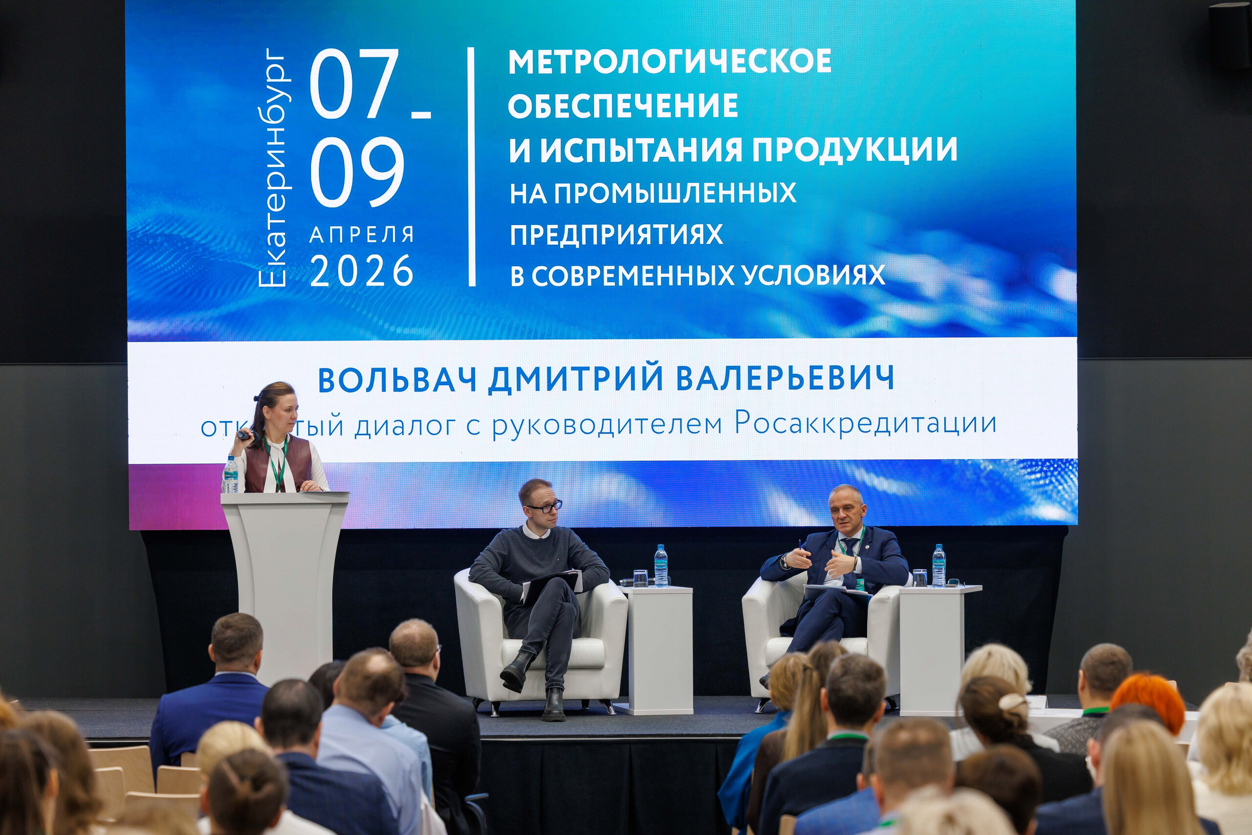 В рамках пленарного заседания состоялся открытый диалог с руководителем Федеральной службы аккредитации Дмитрием Вольвачем, продолжавшийся около полутора часов. Участники обсудили профессиональную подготовку метрологов, обновление парка оборудования преимущественно отечественного производства, совершенствование работы ФГИС Росаккредитации, а также ход взаимодействия с Росстандартом по вопросам оптимизации обмена данными между ФГИС Росаккредитации и ФГИС “АРШИН”.